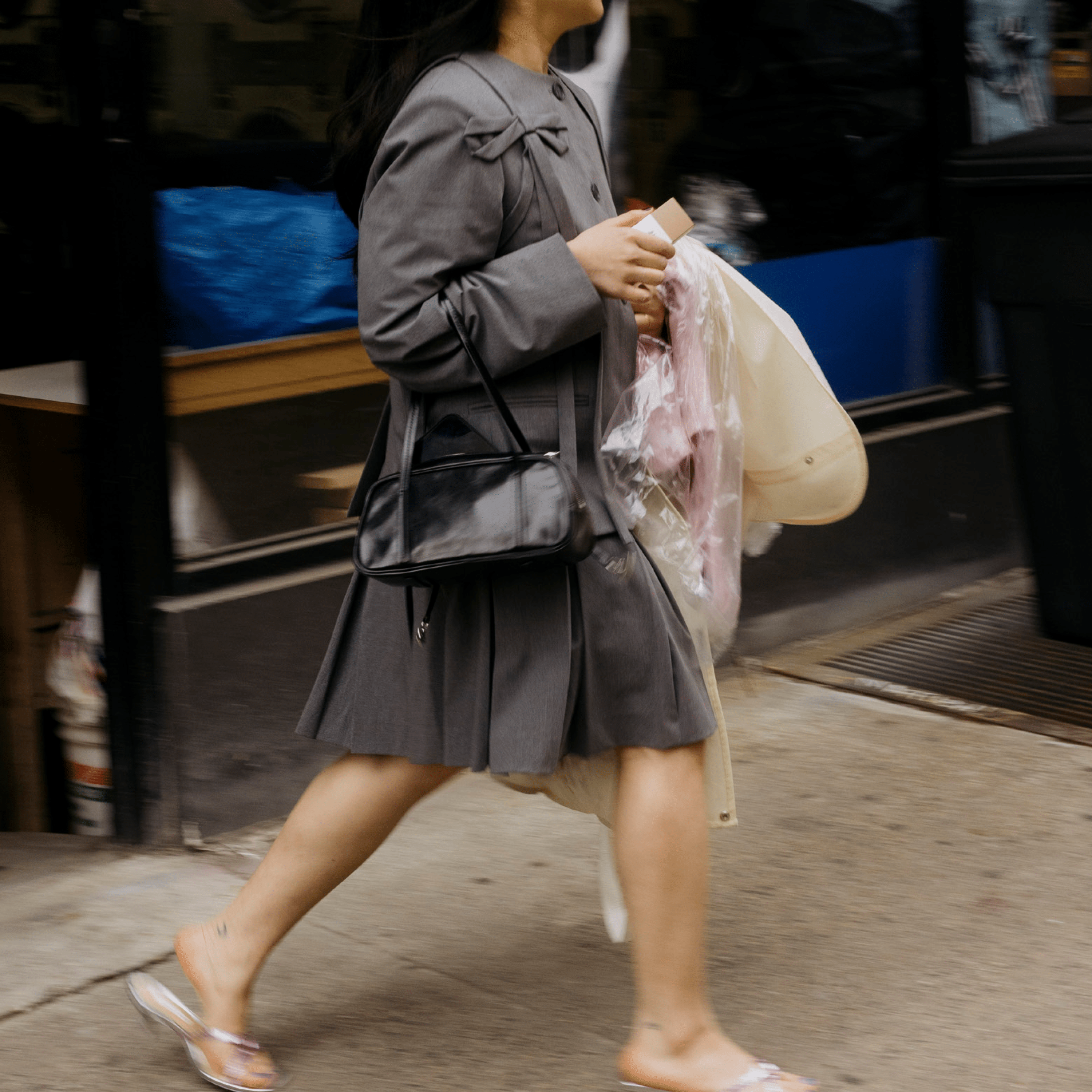 Lunch on the go. A magazine on her lap. DTFS by her side. Sun’s out, but she’s covered.