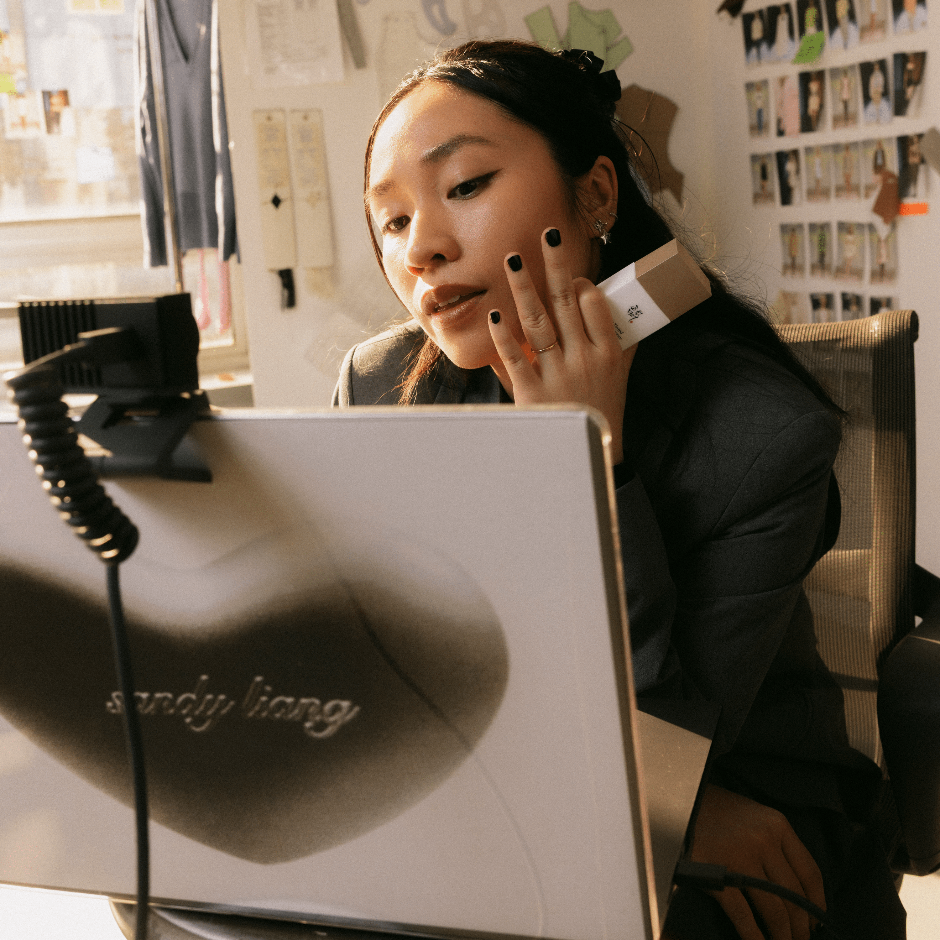 Emails. Deadlines. DTFS rolling between a pile of swatches. Uncapped—like she just swiped it on between meetings.