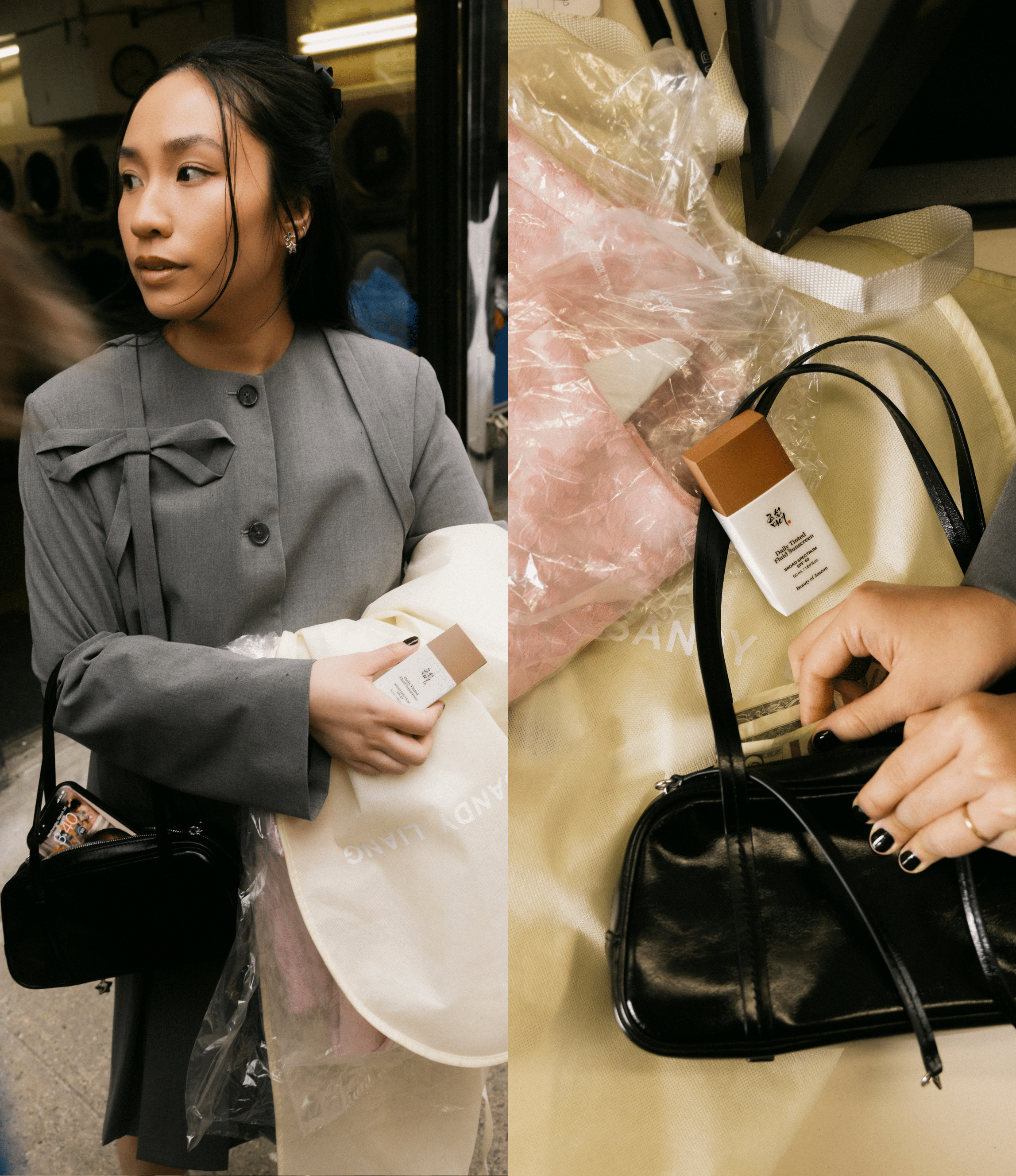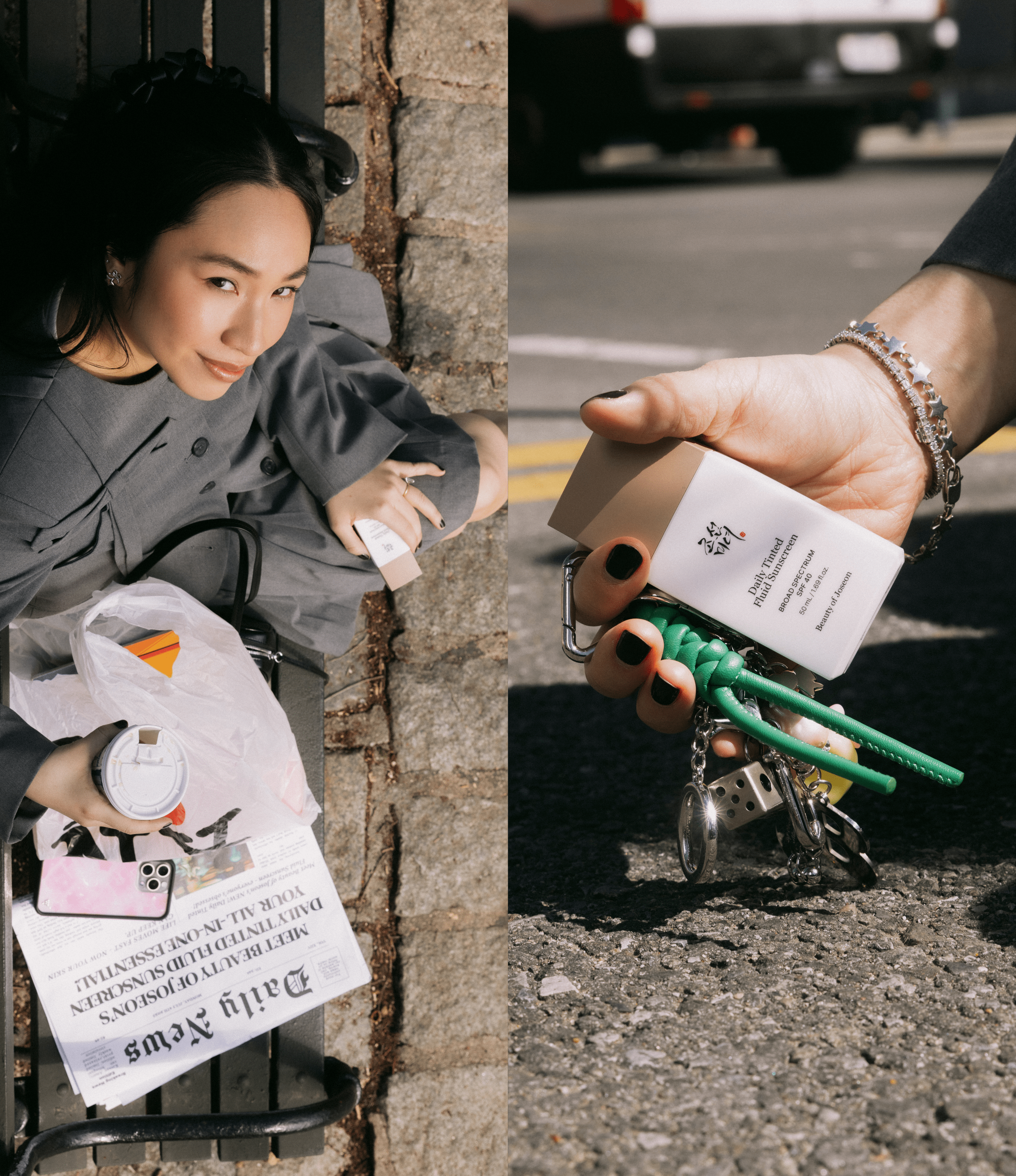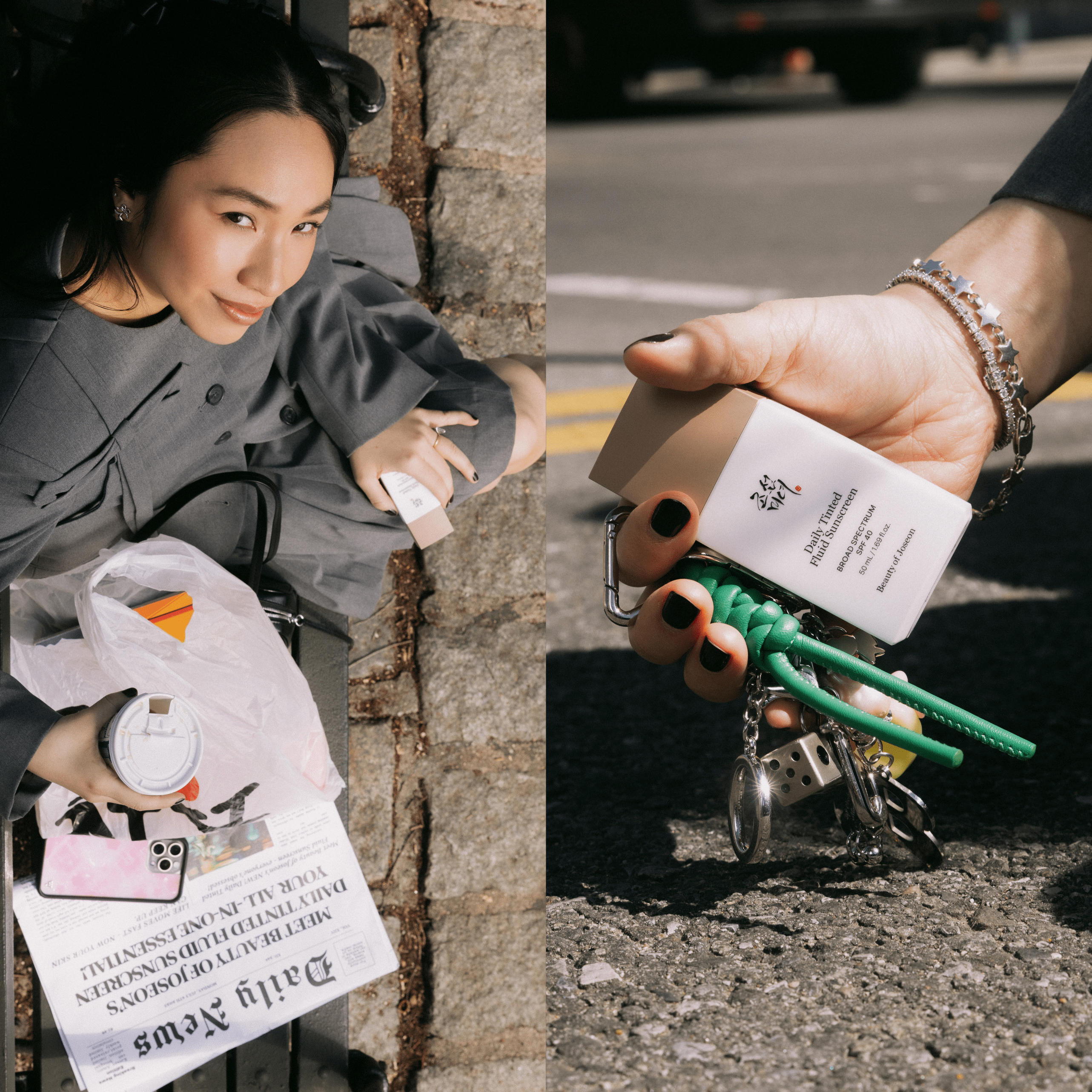 She hops into a cab. A quick glance in her compact mirror, DTFS in hand. Morning routine—handled before the next red light.