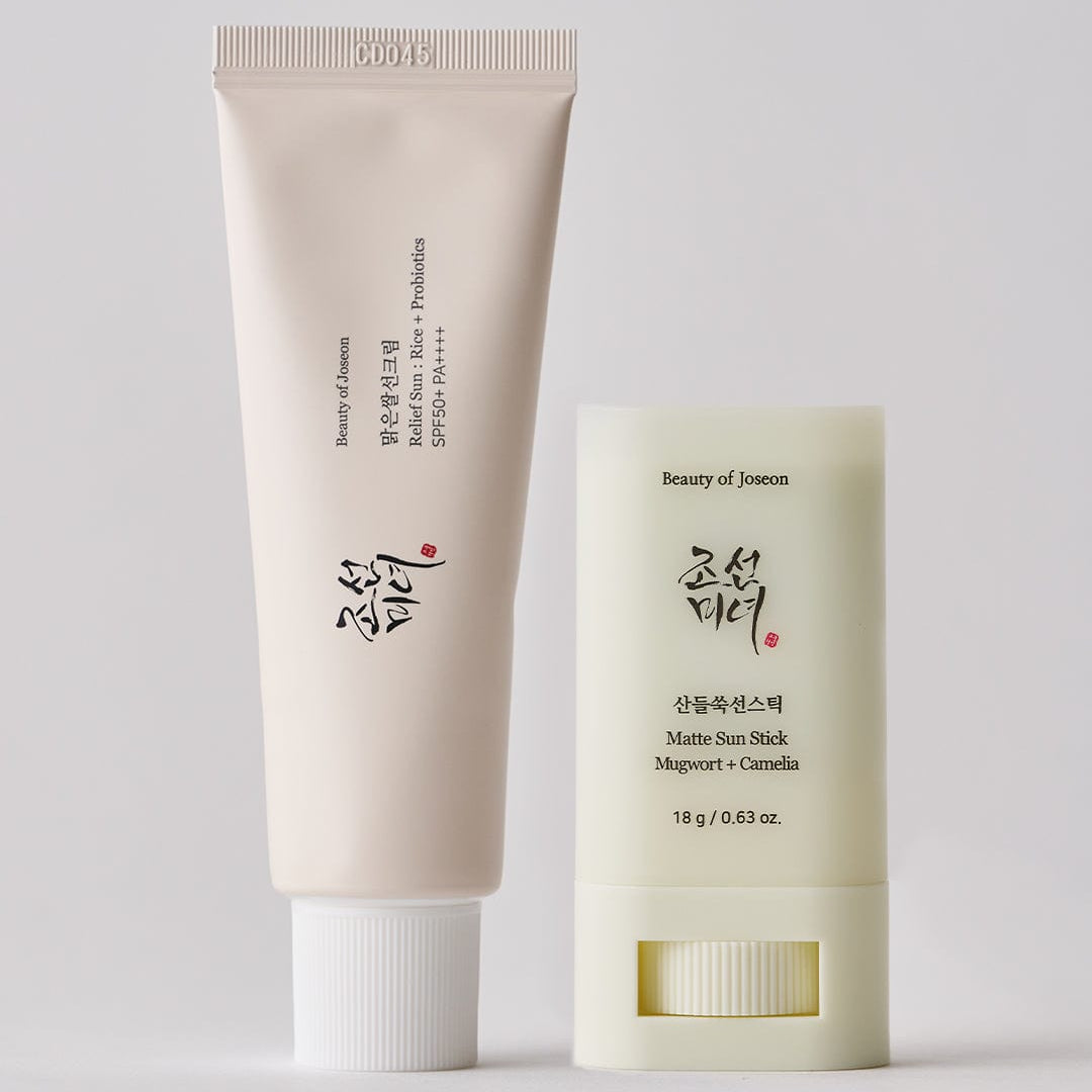 一日中、毎日しっかり紫外線対策ができる完璧なデュオです。ベストセラーの Relief Sun : Rice + Probiotics Sunscreen と、使いやすい Matte Sun Stick : Mugwort+Camelia がセットになっています。