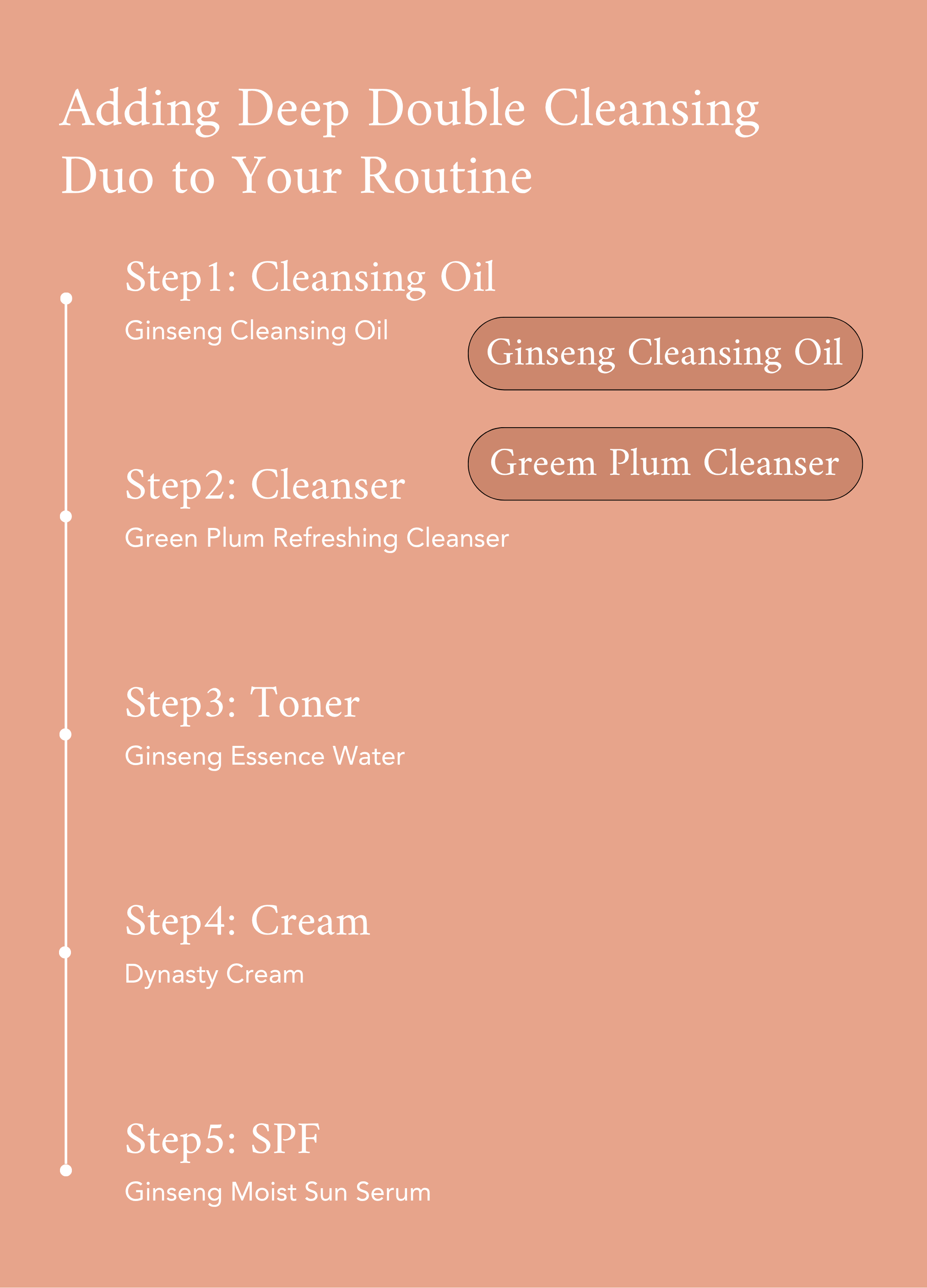 Start with the Ginseng Cleansing Oil on dry skin to dissolve makeup and sunscreen, then rinse with lukewarm water. Follow with the Green Plum Cleanser on damp skin to remove remaining impurities, then rinse and continue your skincare routine.