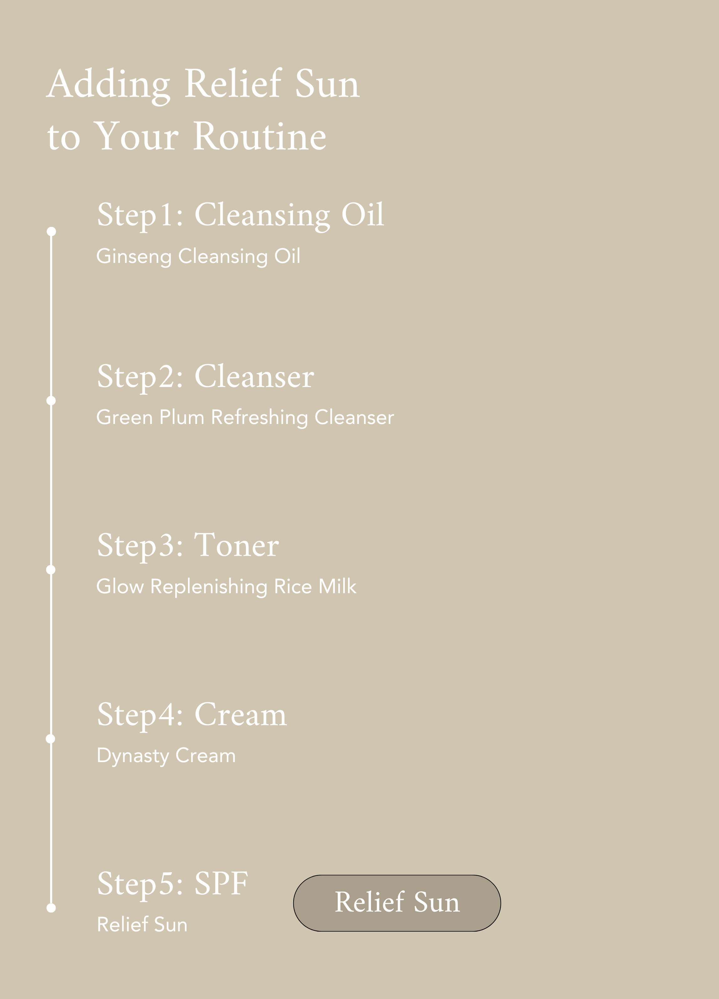 That depends on your skin type! If you have dry, dehydrated, or normal skin, layer this sunscreen over Dynasty Cream (or your favorite moisturizer). Combination skin types can also add moisturizer if needed. If you have oily skin, we recommend either skipping an additional moisturizer or swapping this formula out for our Relief Sun Aqua-Fresh : Rice + B5 (SPF50+ PA++++), which is specifically formulated for oily or combination skin types.